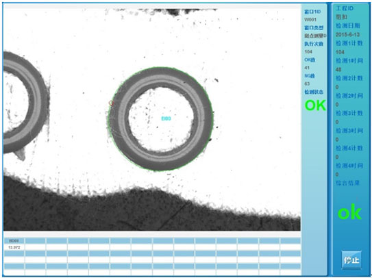 系統(tǒng)采用進(jìn)口高分辨率工業(yè)相機(jī),可以快速獲取圖像,通過圖像識別、分析和計算,實時偵測紐扣生產(chǎn)中是否出現(xiàn)不良品,并輸出相應(yīng)檢測信號提示,以便于對有缺陷的產(chǎn)品進(jìn)行處理。