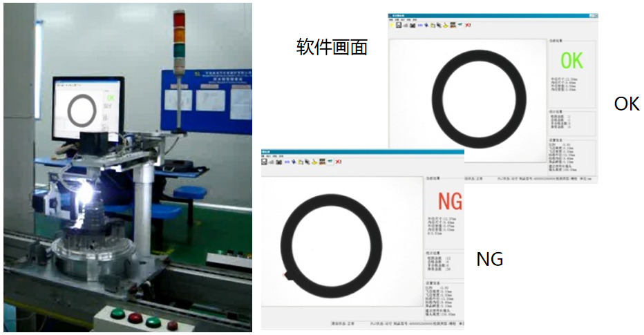 “密封圈缺陷視覺檢測(cè)系統(tǒng)”針對(duì)密封圈質(zhì)量(邊緣缺口毛刺、內(nèi)外徑尺寸)進(jìn)行檢測(cè)。相機(jī)快速采集生產(chǎn)線上密封圈圖像,將圖像數(shù)據(jù)傳送到圖像處理系統(tǒng),圖像處理系統(tǒng)對(duì)每幅圖像進(jìn)行預(yù)處理、尺寸測(cè)量等運(yùn)算,通過與標(biāo)準(zhǔn)模板圖像及設(shè)定參數(shù)進(jìn)行比較,來判斷產(chǎn)品是否合格,輸出廢品報(bào)警信息及剔廢控制信號(hào),由機(jī)械系統(tǒng)剔除廢品,從而保證密封圈質(zhì)量。本系統(tǒng)主要應(yīng)用于各類規(guī)格密封圈生產(chǎn)過程中的缺陷檢測(cè),并可延伸至相關(guān)產(chǎn)品或行業(yè)的應(yīng)用中。